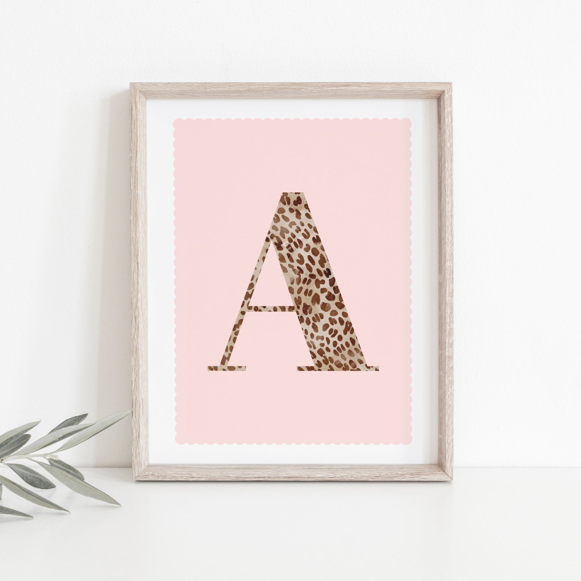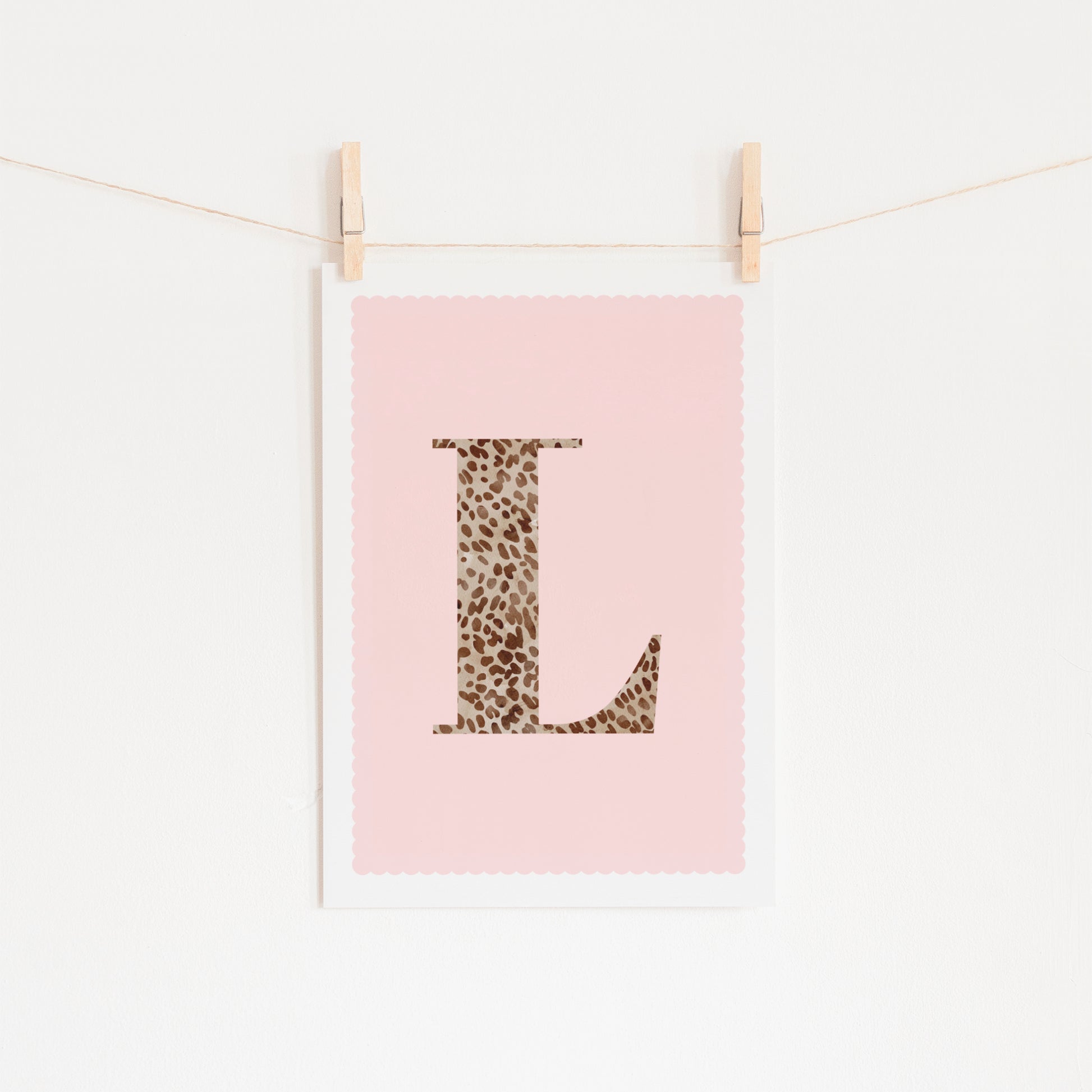 Add a bold and stylish touch to any room with this personalised A4 print, designed to make a statement. Featuring a large capital letter of your choice, filled with a chic leopard print pattern, this artwork sits against a soft pale pink background with a delicate scalloped edge.